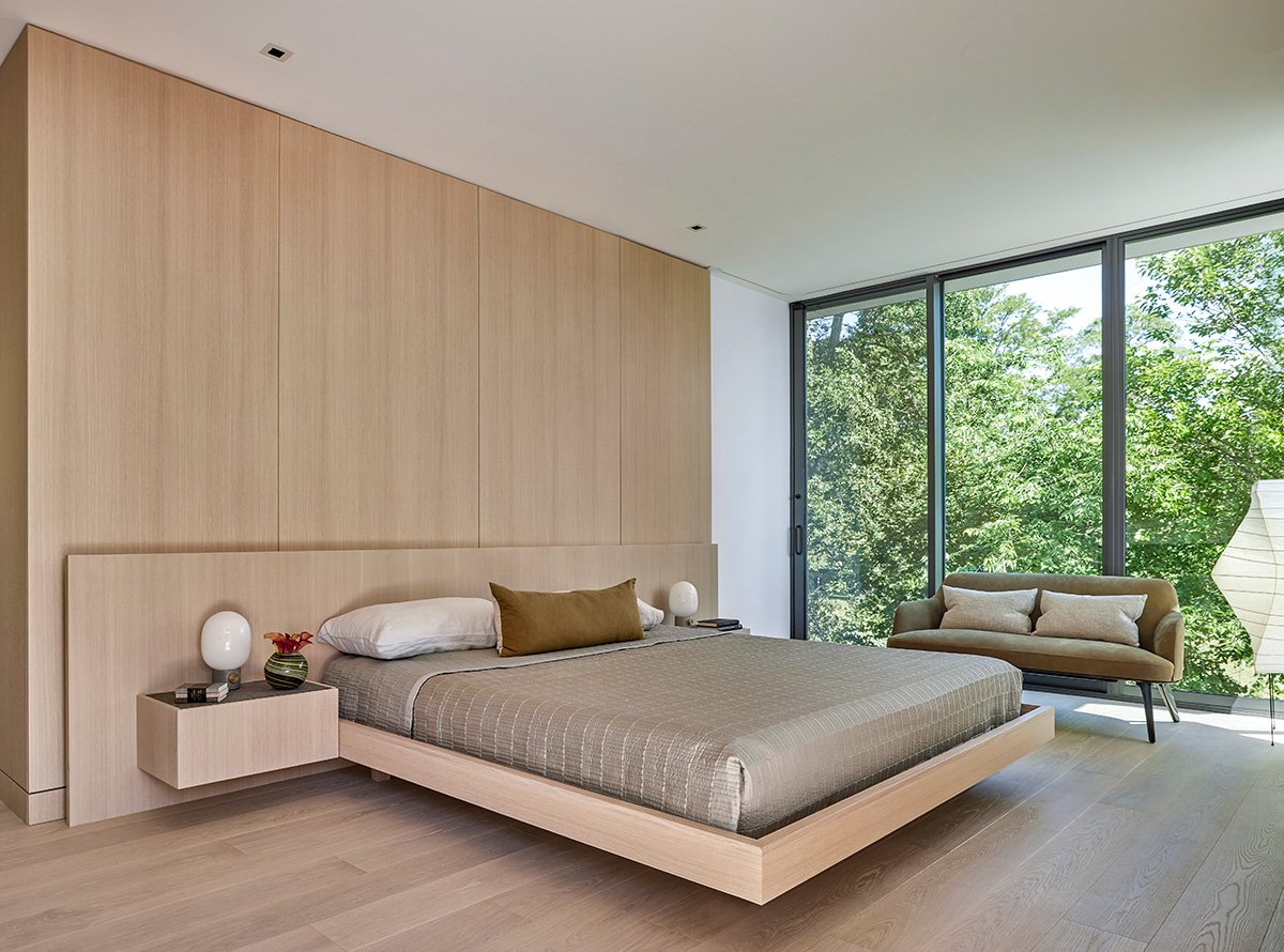 Work Completed: Demeter fabricated extensive white oak and lacquer millwork throughout this lakefront home, including a kitchen that flows into the family room with concealed TV cabinetry above the fireplace. Additional features include a custom master suite with coordinated wall panels, vanity, and bedframe, along with detailed stair and bar millwork that ties the palette together.
