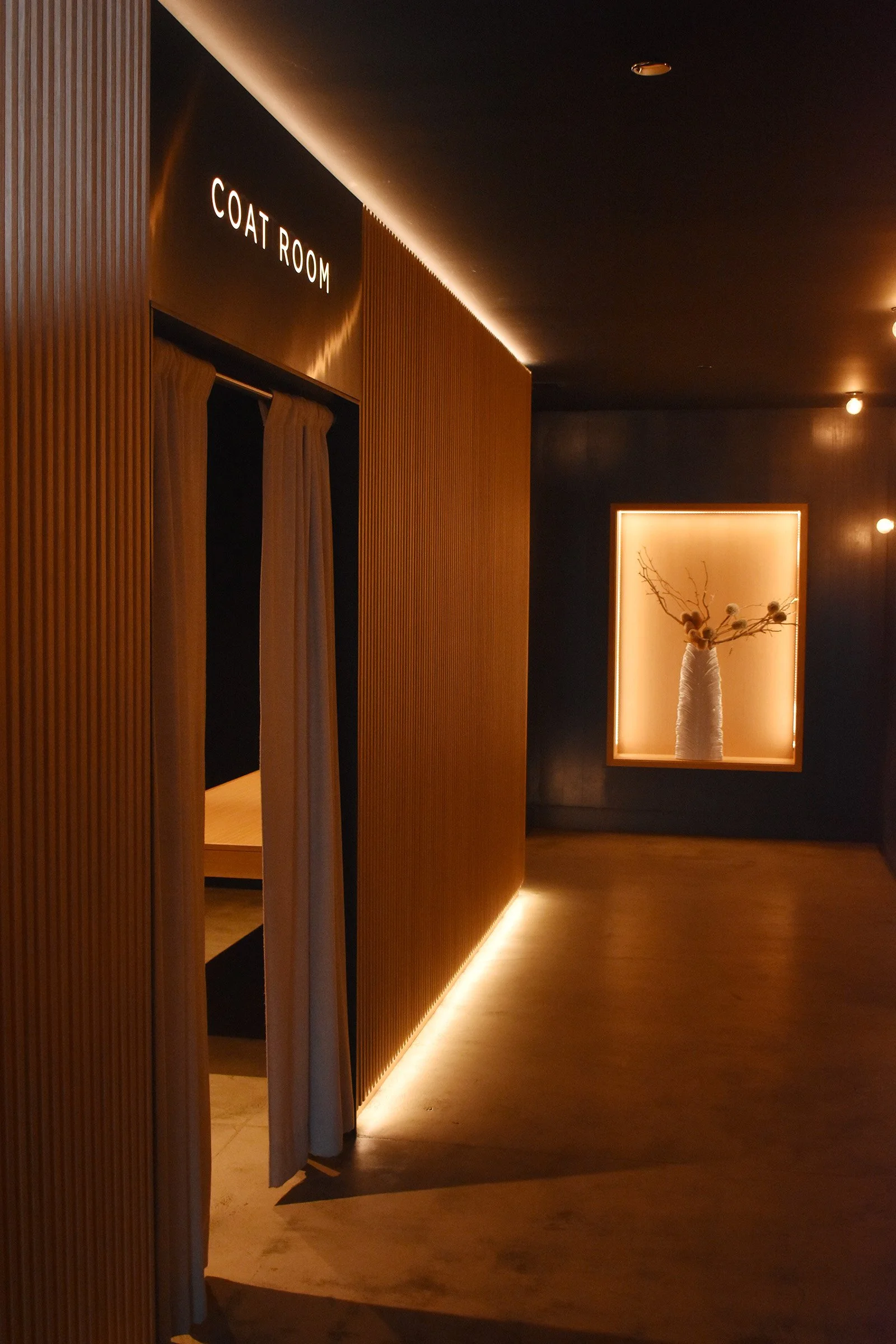 Work Completed: Demeter fabricated millwork throughout this multi-use event space, including wall paneling with concealed doors, a custom bar and DJ booth, and built-in banquettes for the green room. Additional details include full restroom vanities with fluted wood aprons, makeup counters with illuminated mirrors, and a collection of folding white oak tables crafted for flexibility and durability.