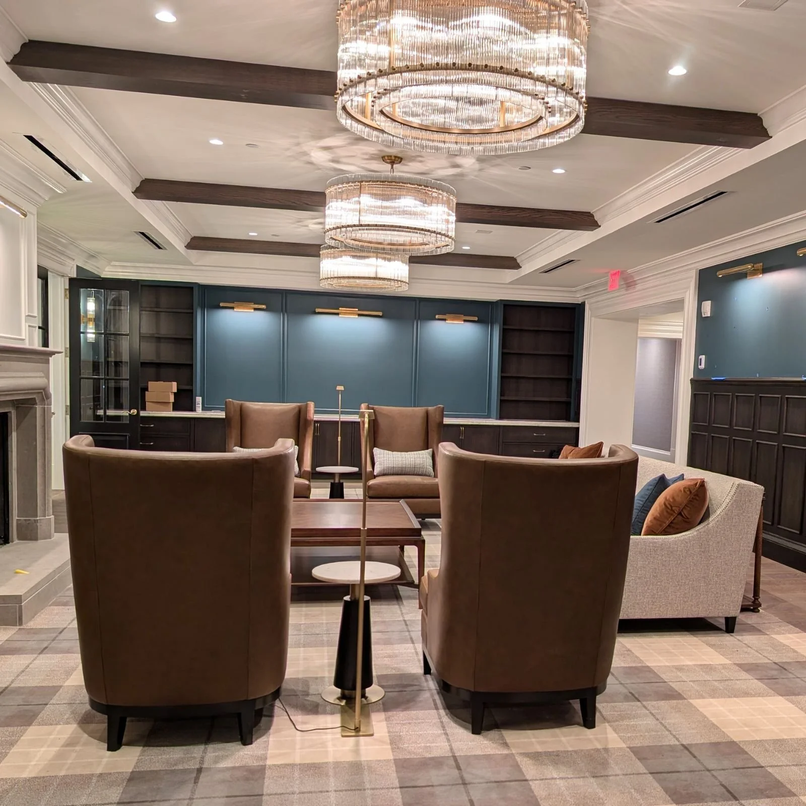 Work Completed: Demeter provided custom millwork throughout the renovated clubhouse, bringing warmth and refinement to a range of member spaces. The work features walnut veneer with brass accents, ash tabor finishes, and a custom wine feature wall, all tied together with more than 13,000 feet of trim. These elements elevate the club’s dining and lounge areas with a consistent level of finish quality that enhances the overall experience for members and guests.